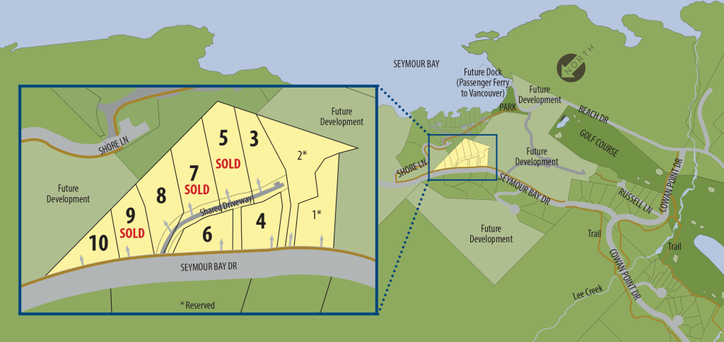 New home construction is underway at Seymour Landing’s newest subdivision. This 10‑lot subdivision on Seymour Bay Drive is nestled into the coastal bluffs above Seymour Bay, offering views of the Strait of Georgia, Vancouver, and Mount Baker. These properties will revel in the ever-changing viewscape, and are just a short walk to Bowen’s 9‑hole public golf course, the beach, and an extensive trail network.